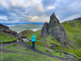 Hiker stopped to enjoy the incredible view of dramatic landscape on Isle of Skye