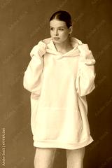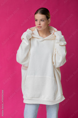 Beautiful blonde woman in a white hoodie and blue jeans posing on a pink background