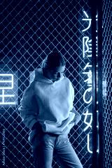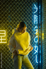 Beautiful blonde woman in white hoodie and blue jeans posing against neon background