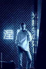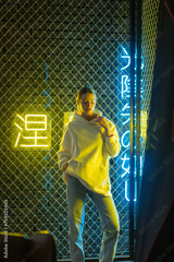 Beautiful blonde woman in white hoodie and blue jeans posing against neon background