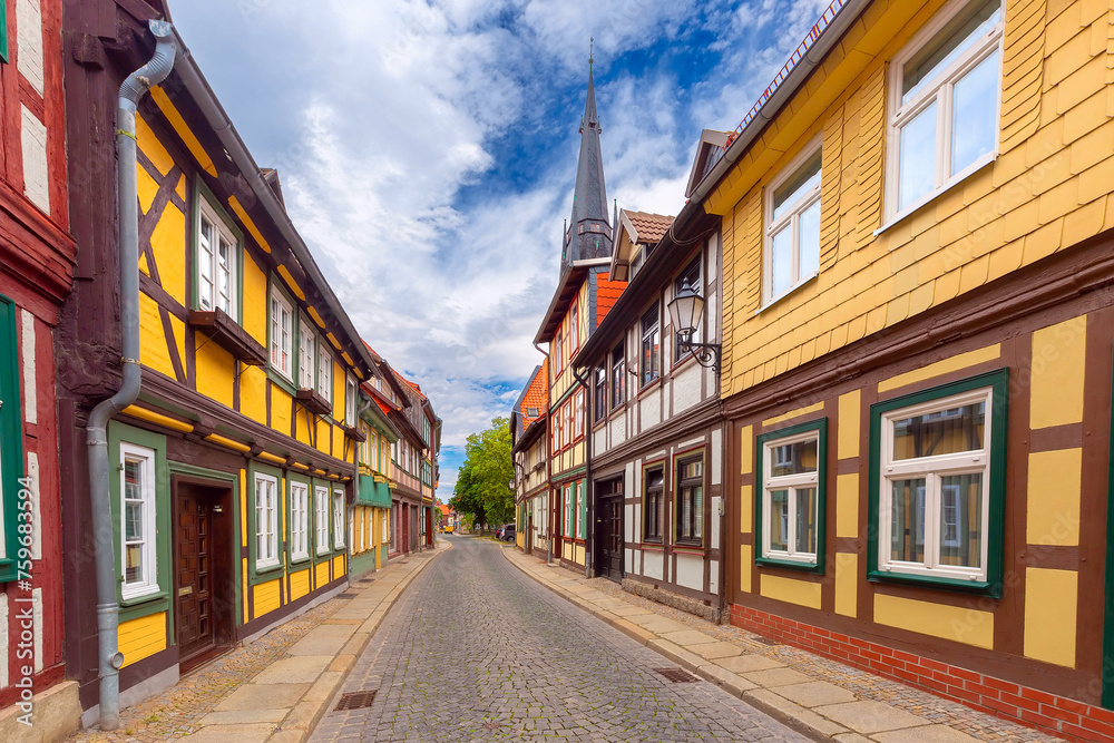 Medieval street with half-timbered houses in Wernigerode, Saxony-Anhalt, Germany