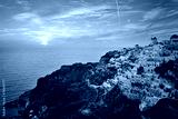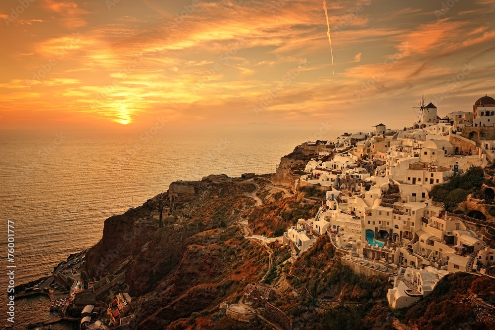 sunset over famous blue and white city Oia,Santorini