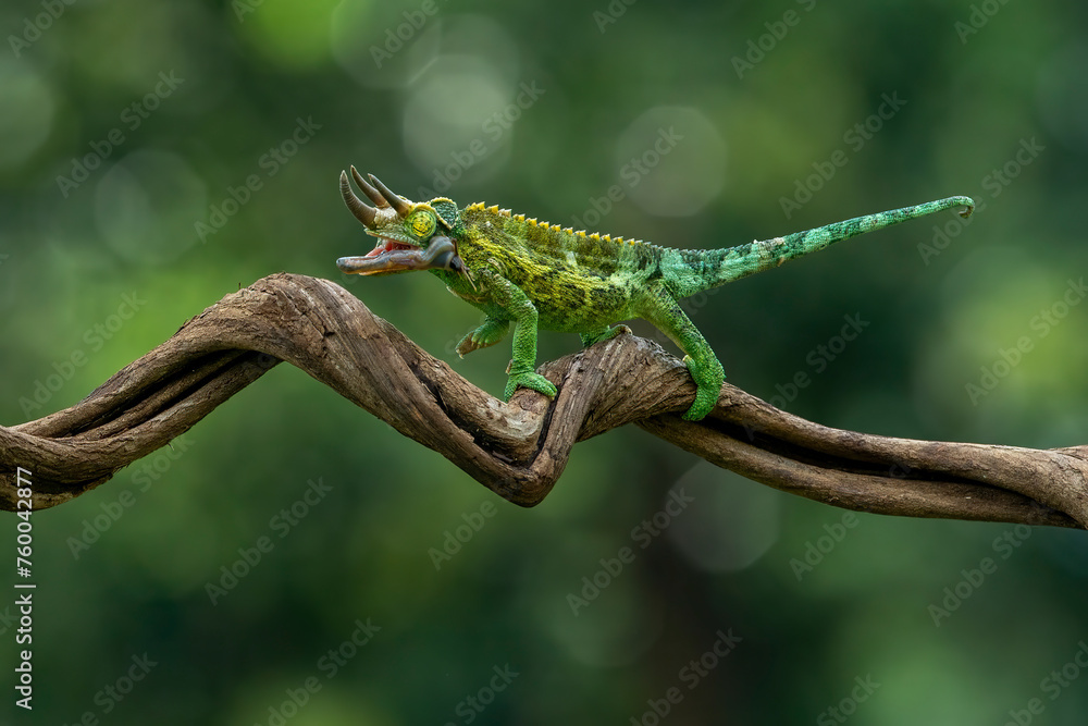 Jackson’s chameleon (Trioceros jacksonii) is eating an insect as its prey in Java rainforest, Indonesia.