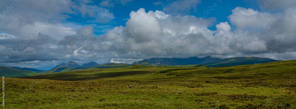 Panoramic view of the green rugged landscape with vast meadows and mountains