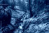 Mały strumień płynący w głebokim rowie przez gęsty iglasty las. Jest wczesny ranek, między drzewami unosi się delikatna mgła oświetlana promieniami wschodzącego słońca.
