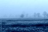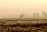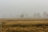 Rozległa równina w zimowy, bezśnieżny poranek pokryta żółtą, suchą trawą. Nad ziemią unosi się gęsta mgła. We mgle widać niewyraźnie w oddali bezlistne drzewa.
