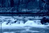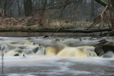 Mała, dzika, nieuregulowana rzeka bezśnieżną zimą. Woda ma ciemnobrązowy kolor. Wokół rośnie wysoki, bezlistny las. Koryto rzeki przecina mały spieniony wodospad.