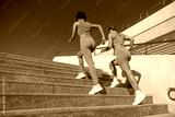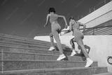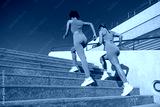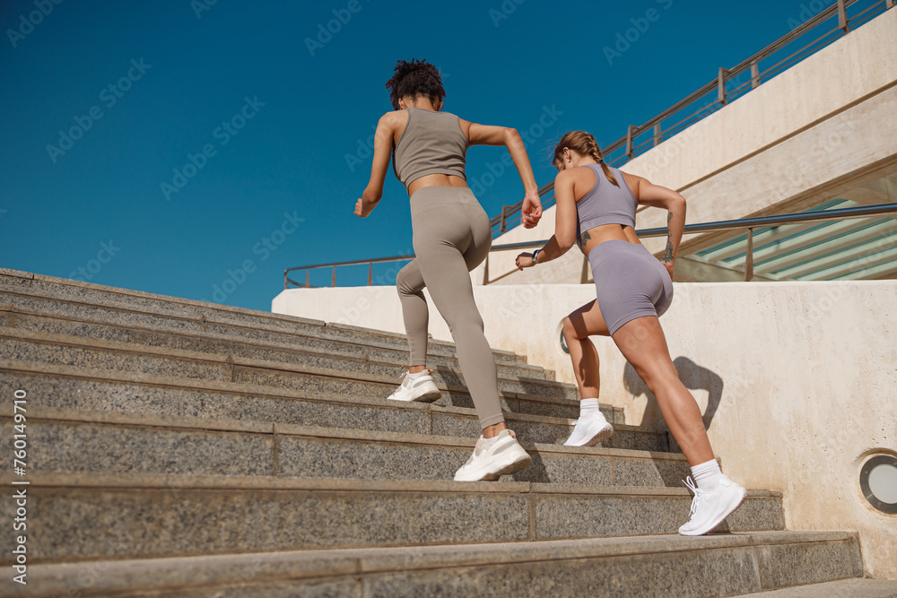 Two active female athlete friends in sportswear running on steps outdoors on a sunny day
