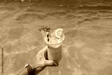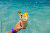 Close-up view of a male hand holding a glass with an alcoholic cocktail against the backdrop of the blue waters of the Caribbean Sea. Curacao.