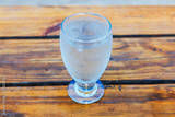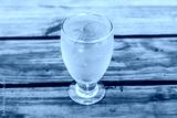 Close-up view of a glass filled with ice cubes, covered in condensation, and filled with cold water on a wooden table in a restaurant.