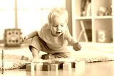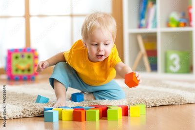 child toddler playing wooden toys at home