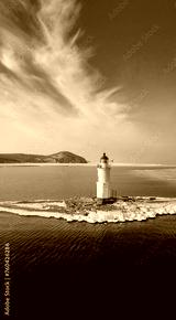 Aerial view of the lighthouse in winter in the ice at dawn