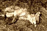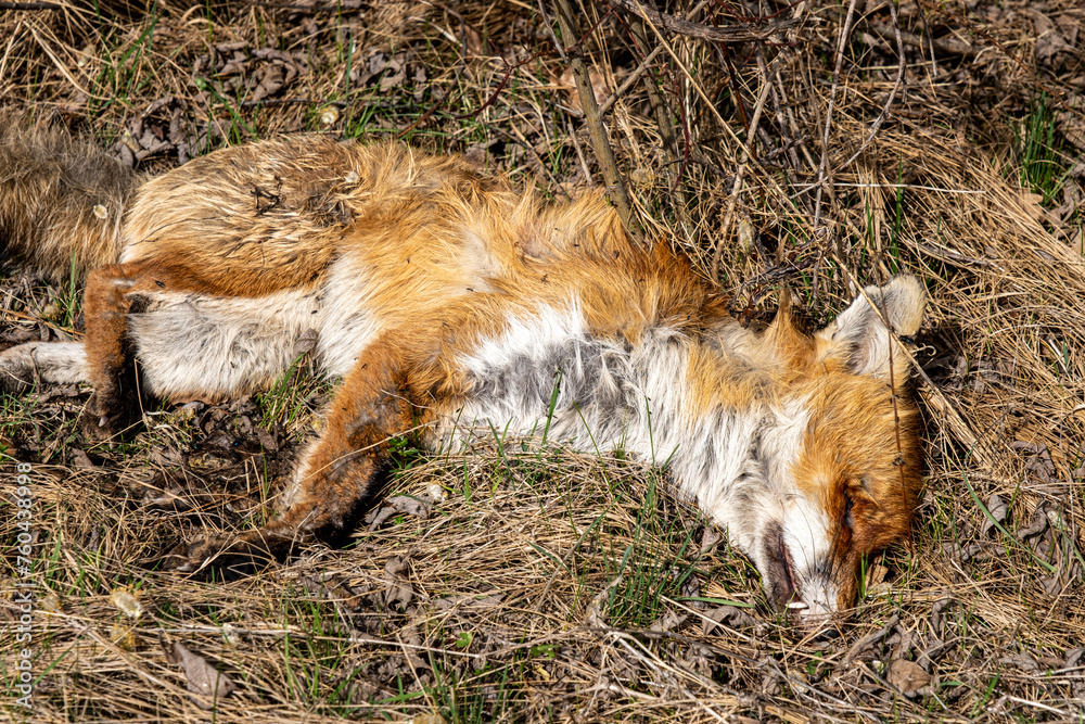a dead Wildlife Red Fox in the field and flies that fly around the corpse and feed on decaying flesh, a poisoned or shot wild animal