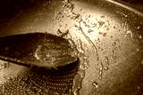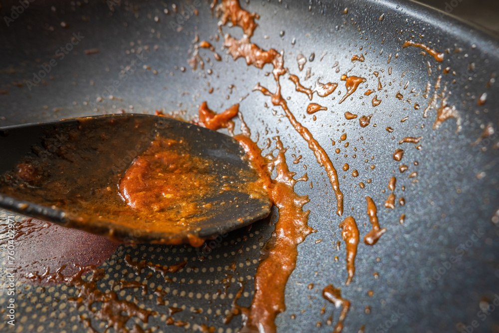 Used empty deep pan with red enchilada sauce leftovers and stirring spoon