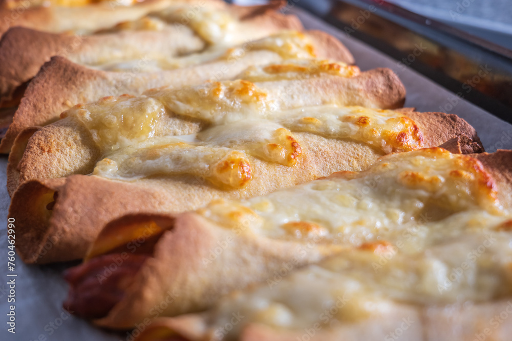 Cooked and ready to eat homemade mexican enchiladas on baking oven tray