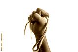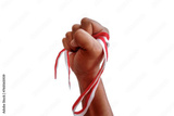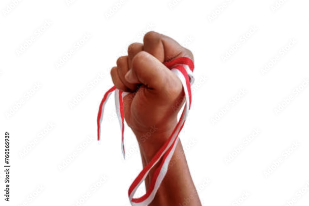 hand holding an Indonesian red and white ribbon. Indonesian independence day concept