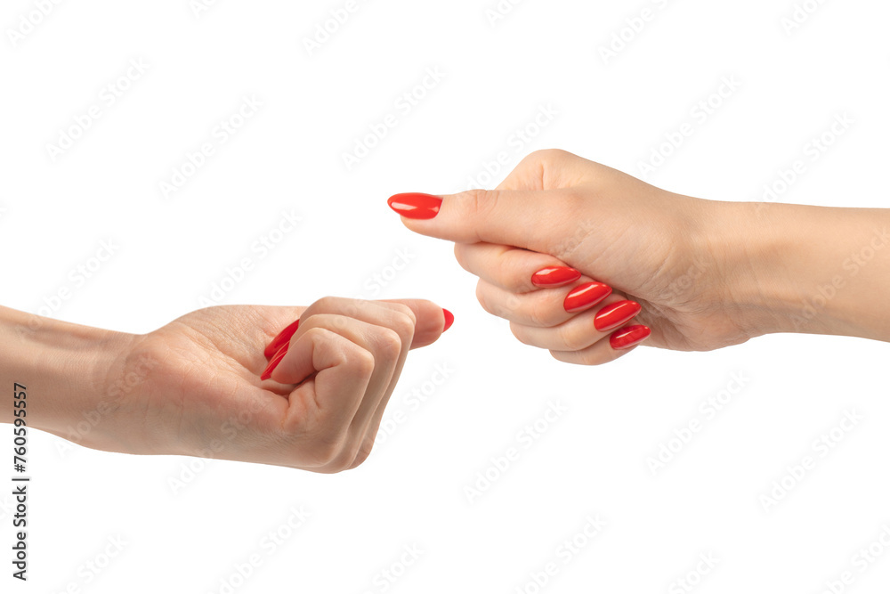 Woman hands with red nails isolated on a white background. Red nail polish.