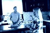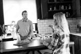 Smiling man and woman chopping fresh vegetables on a kitchen island, enjoying a healthy cooking activity together