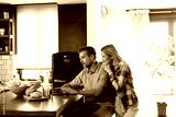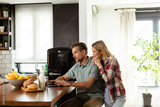 Cheerful couple enjoys a light-hearted moment in their sunny kitchen, working on laptop surrounded by a healthy breakfast