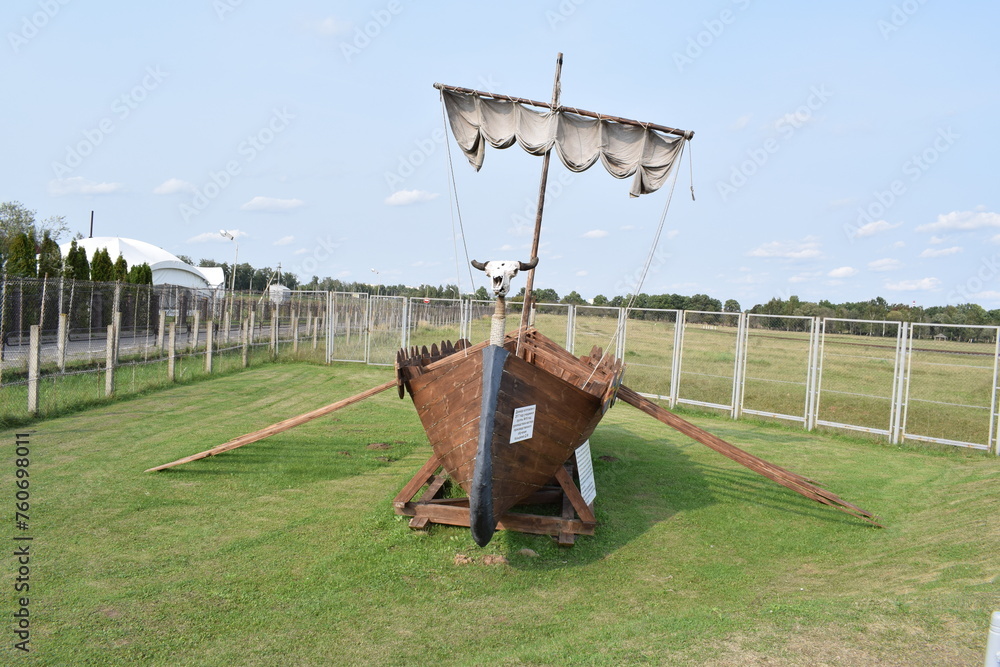 A replica of an ancient Viking drakar on the city embankment on a sunny September day