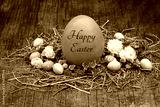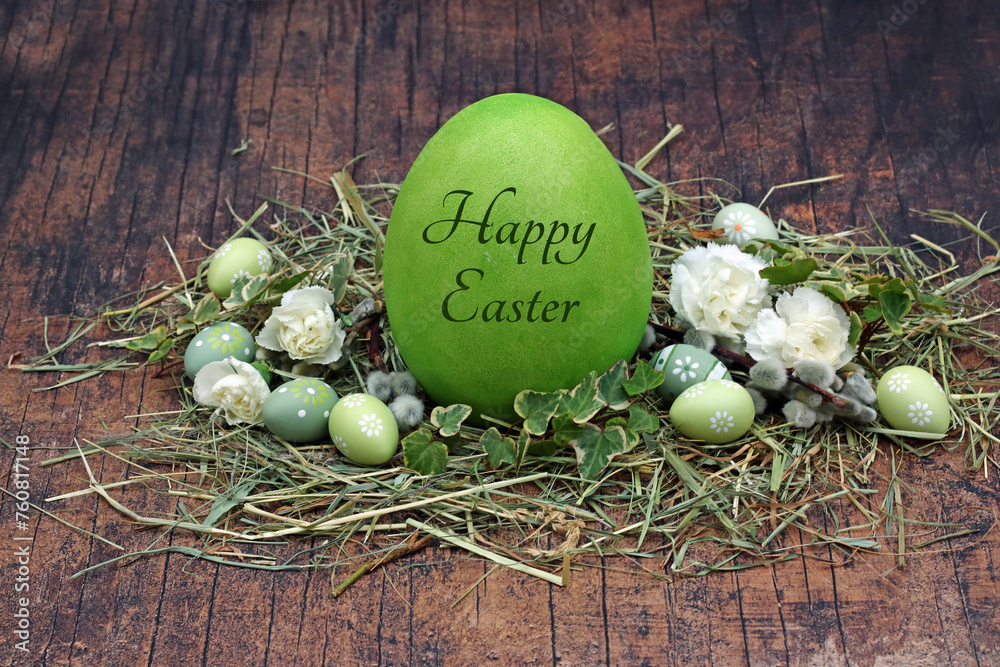 Greeting card Happy Easter: Labeled Easter egg with flowers.