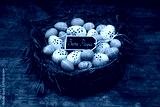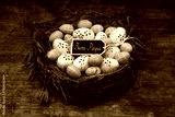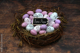 Biglietto d'auguri Buona Pasqua. Uova di Pasqua in un nido con il testo Buona Pasqua.