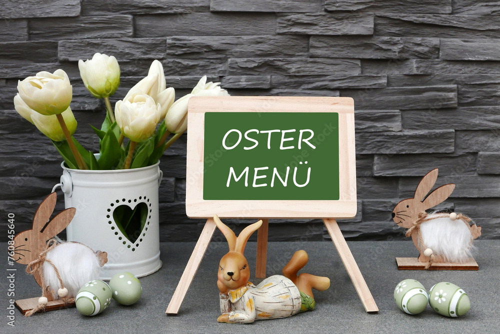 Ein Strauß Tulpen mit Ostereiern und dem Text Ostermenü auf einer Tafel.