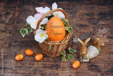 Carte de vœux Joyeuses Pâques : panier de Pâques avec un œuf de Pâques étiqueté.