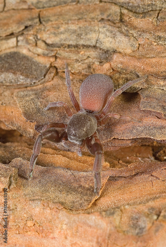 Velvet ground dwelling spider (Palpimanus gibbulus). Mugoni pine forest. Alghero. Sardinia. Italy