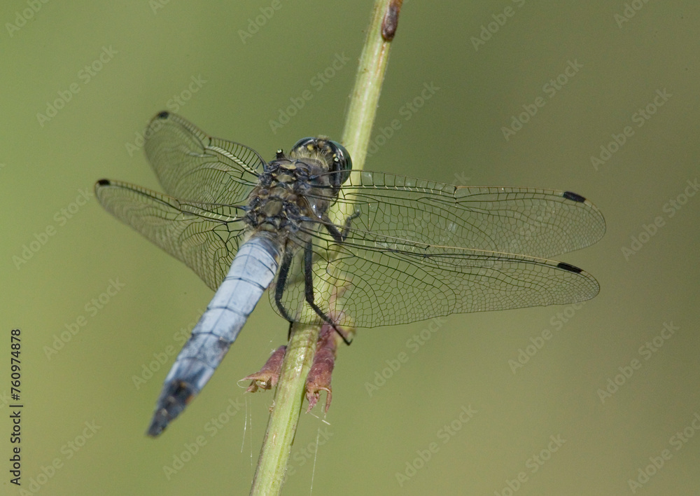 close up of blue dragonfly on a branch Libelula depressa, Baratz lake, Sassari, Sardinia, Italy