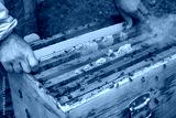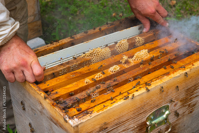 Beekeeper remove a frame of honeycomb from beehive with bee smoker