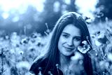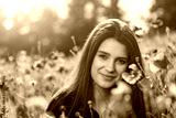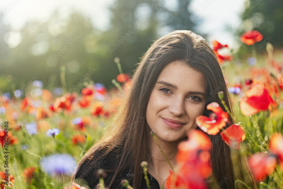 Beautiful smiling brunette young woman is posing in a red poppies field. Horizontal.