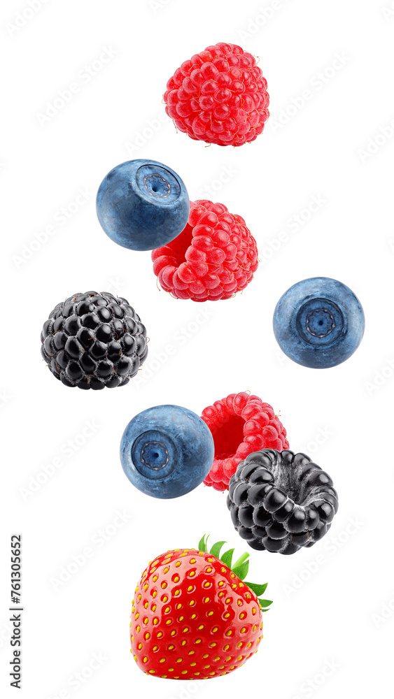 Falling wild berries mix, strawberry, raspberry, blueberry, blackberry, isolated on white background, full depth of field