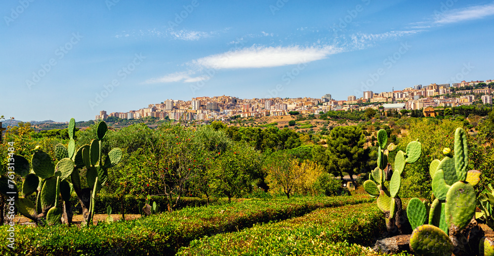 Panoramic view of Agrigento, a hilltop city on Sicily's southwest shore. Green summer park on foreground. August 2023.