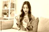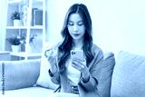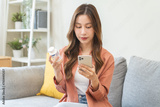 Health care asian young woman using smart phone for reading, searching prescription on bottle medicine, pill label text about information online, instructions side effects, pharmacy medicament concept