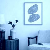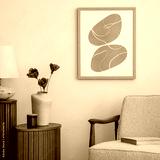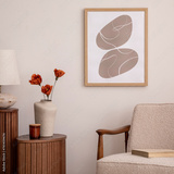 Warm and cozy composition of living room interior with mock up poster frame, boucle armchair, wooden stand, beige vase with dried flowers, candle, lamp and stylish accessories. Home decor. Template.