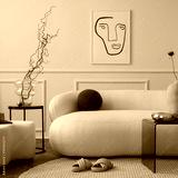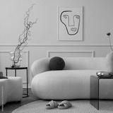 Cozy composition of living room interior with mock up poster frame, white sofa, round pillow, glass coffee table, beige wall with stucco, chrom bowl and personal accessories. Home decor Template.