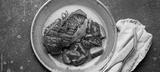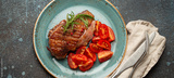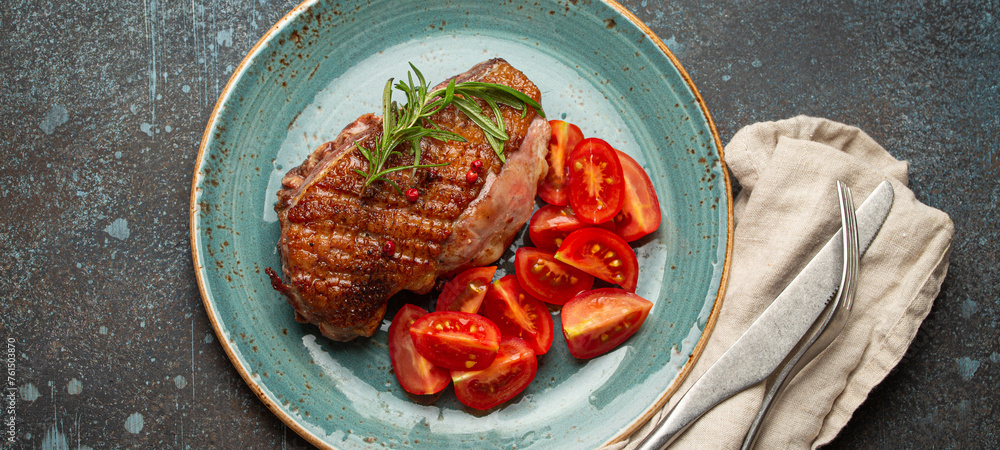 Delicious roasted duck breast fillet with golden crispy skin, with pepper and rosemary, top view on ceramic blue plate served with cherry tomatoes salad, rustic concrete rustic background