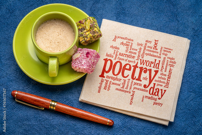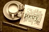 world poetry day - word cloud on a napkin with coffee, cultural event