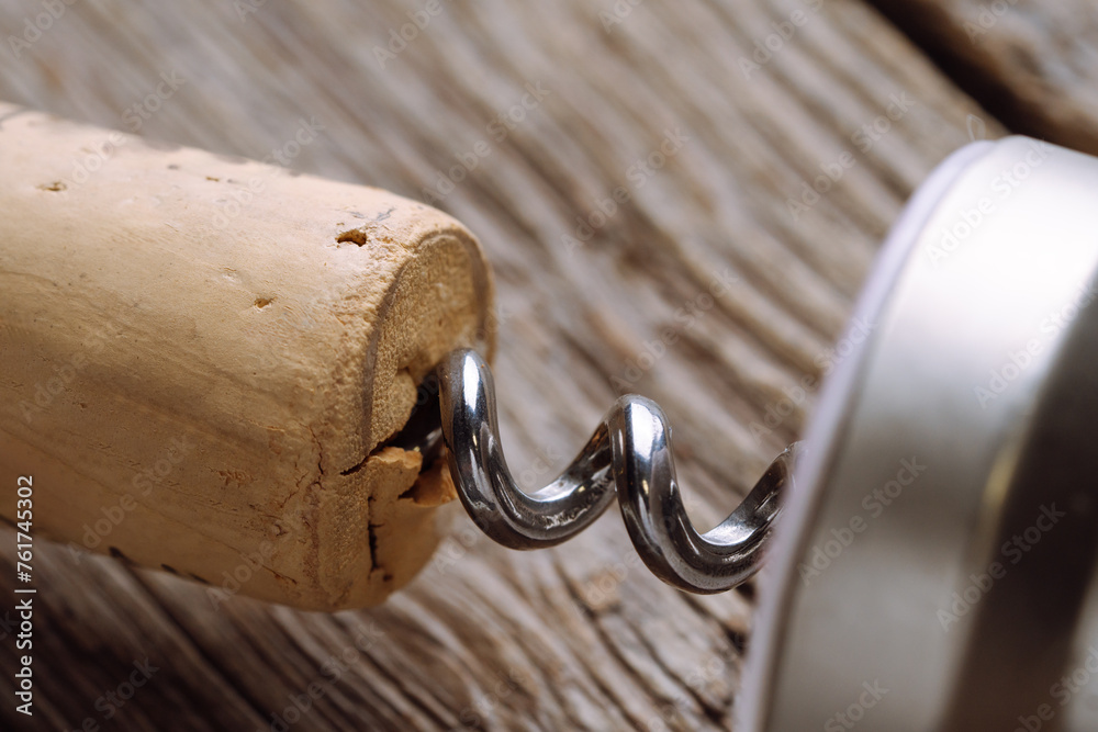Close-up of corkscrew and wine cork, essential tools for opening a bottle of wine. The corkscrew is positioned to remove the cork, ready for an enjoyable wine-drinking experience.