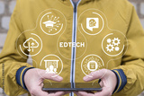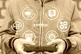 Man holding smartphone and using virtual interface sees text: EDTECH. EdTech Education Technology distance electronic learning online concept.