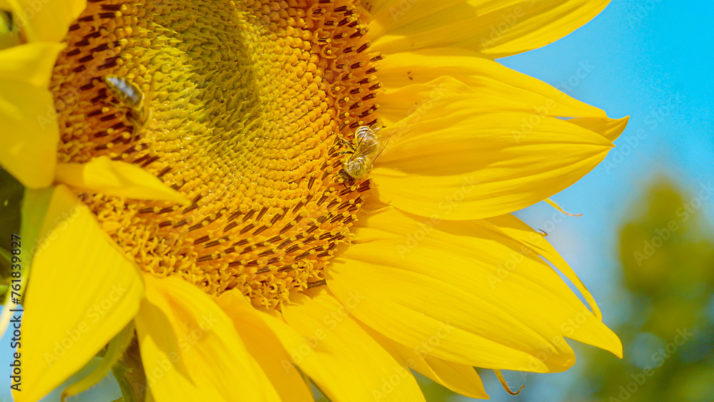 MACRO: Two little worker bees collect pollen from a vibrant yellow sunflower.