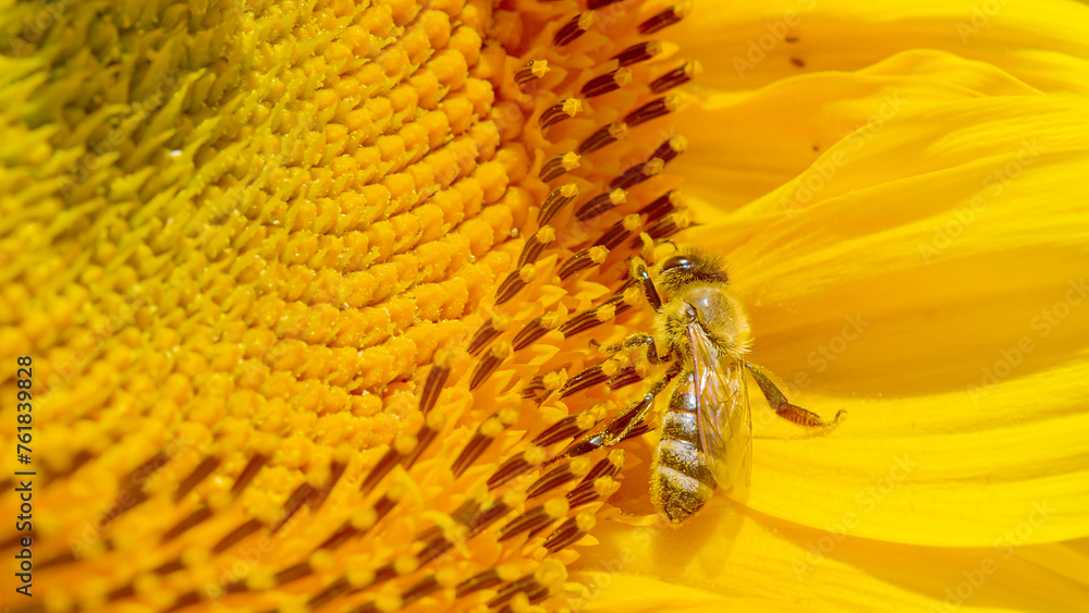 MACRO: Detailed shot of a tiny bee collecting pollen from a blooming sunflower.