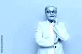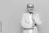 pensive old businesswoman in glasses and business clothes planning and thinking on yellow isolated background, elderly pensioner grandmother in blazer dreaming and imagining