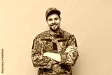 young Ukrainian army soldier in pixel camouflage uniform stands with his arms crossed on a yellow isolated background, Ukrainian military cadet looks at the camera and smiles
