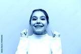 cheerful teenage girl with braces celebrates victory and good luck on pink isolated background, child winner rejoices at success and achievements