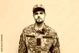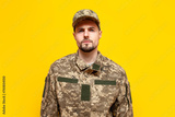 serious Ukrainian army soldier in pixel camouflage uniform on yellow isolated background, Ukrainian military cadet looking at camera