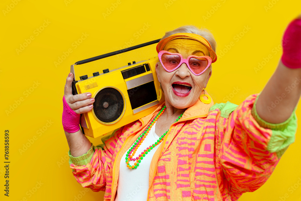 funny crazy granny in hipster clothes listening to music on tape recorder and taking selfie on yellow isolated background, elderly cool woman dancing at party and smiling