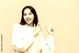 young asian girl with braces points with her hands to the side on a yellow isolated background, korean girl showing and advertising copy space