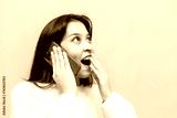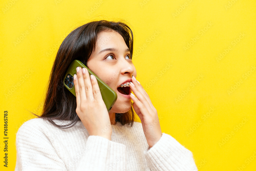 young shocked asian woman with braces talking on phone over yellow isolated background, korean girl talking on cell phone in amazement